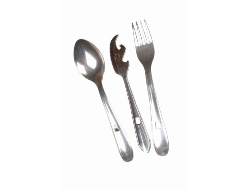 Bestekset voor onderweg, mes, lepel, vork, flesopenerBestekset voor onderweg. Verpakt in een katoenen zakje en inclusief servet. Bestekset bestaat uit een vork, lepel en mes met opener.